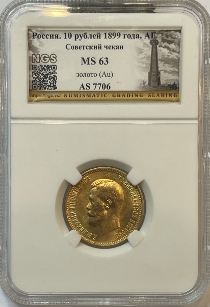 В центре изображен Малый Государственный Герб Российской империи - двуглавый орёл, головы которого увенчаны двумя коронами, третья, большая корона над ними. Все они соединены орденской лентой ордена Св. Апостола Андрея Первозванного. На груди орла расположен Московский герб, в щите изображен Георгий Победоносец с копьем поражающий дракона. Вокруг щита цепь ордена Св. Апостола Андрея Первозванного. На крыльях изображены гербы: Царства Казанского, Польского, Херсонеса Таврического, Астраханского, Сибирского, Грузинского, герб соединенных княжеств Киевского, Новгородского и Владимирского и герб Великого Княжества Финляндского — по 4 на каждое крыло. В правой лапе орла – скипетр, в левой – держава. Под ним слева направо изображены: номинал - надпись «10 РУБЛЕЙ» и дата выпуска «1899 Г.». По окружности канта имеются рельефные элементы, выполненные в виде зубцов.