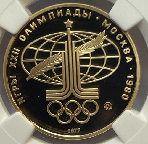 Слева и сверху вдоль канта слова «ИГРЫ XXII ОЛИМПИАДЫ», справа разделенные точкой слово «МОСКВА» и год проведения XXII Олимпиады «1980», в середине эмблема XXII Олимпийских игр и за ней аллегория спорта и мира в виде земного шара и лежащей перед ним лавровой ветви, ниже справа монограмма монетного двора «ММД», внизу у канта год выпуска монеты «1977».