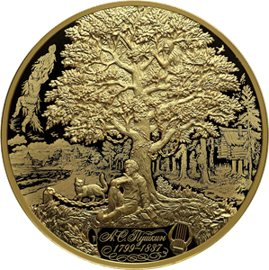 рельефное изображение А.С. Пушкина, сидящего под сказочным дубом, на фоне выполненных в технике лазерного матирования изображений сюжетов его сказок; внизу – изображение свитка с надписью «А.С. Пушкин», годами жизни «1799–1837» и орнаментом, выполненными в технике лазерного матирования, и рельефное изображение лиры.