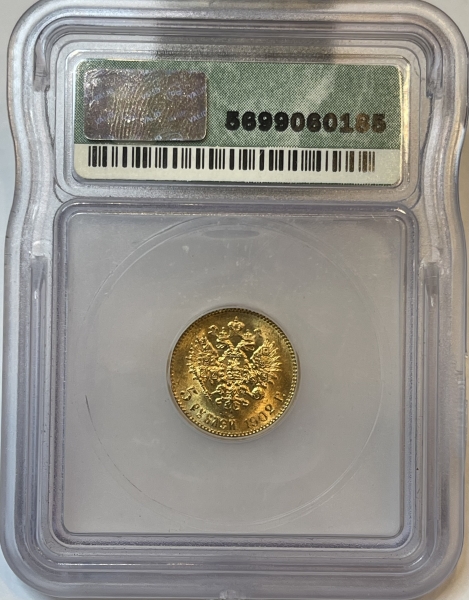 Золотая монета 5 рублей Николай II 1902 г. в слабе ICG MS 66