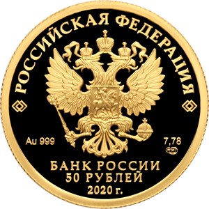 на зеркальном поле диска – рельефное изображение Государственного герба Российской Федерации, над ним вдоль канта – надпись полукругом: "РОССИЙСКАЯ ФЕДЕРАЦИЯ", обрамленная с обеих сторон сдвоенными ромбами, внизу под гербом: слева – обозначения драгоценного металла и пробы, справа – содержание химически чистого металла и товарный знак монетного двора, внизу в центре в три строки – надпись в три строки: "БАНК РОССИИ", номинал монеты: "50 РУБЛЕЙ", год выпуска: "2020 г.".