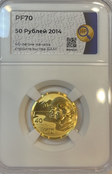 В центре диска – эмблема Банка России (двуглавый орел с опущенными крыльями, под ним надпись полукругом "БАНК РОССИИ"), обрамленная кругом из точек и надписями по кругу – вверху: "ПЯТЬДЕСЯТ РУБЛЕЙ", внизу: слева – обозначения драгоценного металла и пробы сплава, в центре – дата выпуска "2014 г.", справа - содержание химически чистого металла и товарный знак монетного двора.