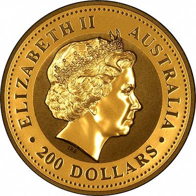 Аверс: Изображение портрета королевы Елизаветы II. Сверху надпись ELIZABETH II — Елизавета II, AUSTRALIA — Австралия и год выпуска монеты. Внизу номинал монеты 100 DOLLARS. С нижней стороны портрета имеется надпись «IRB», обозначающая инициалы автора изображённого портрета – Иена Рэнка-Бродли.