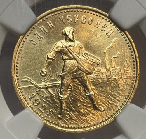 Изображение крестьянина-сеятеля на фоне плуга, восходящего солнца и заводов; по краю монеты точки, вверху надпись - «ОДИН ЧЕРВОНЕЦ», внизу слева — год выпуска - 1923.
