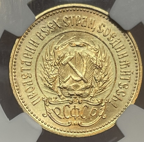Герб РСФСР, окруженный венком из колосьев, и щит с изображением на нем серпа и молота на фоне солнечных лучей; по краю монеты точки вдоль них надписи: сверху - «ПРОЛЕТАРИИ ВСЕХ СТРАН, СОЕДИНЯЙТЕСЬ!», внизу под гербом - «Р. С. Ф. С. Р.».