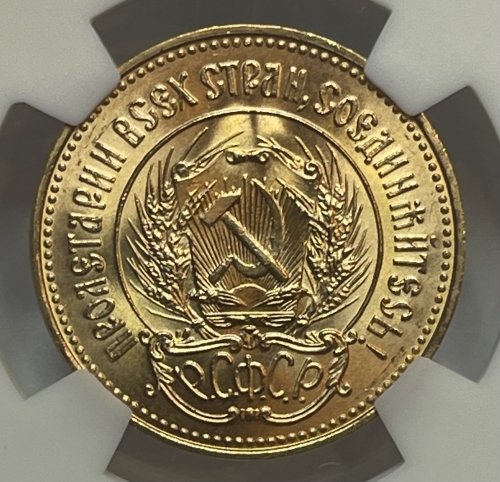 Герб РСФСР, окруженный венком из колосьев, и щит с изображением на нем серпа и молота на фоне солнечных лучей; по краю монеты точки вдоль них надписи: сверху - «ПРОЛЕТАРИИ ВСЕХ СТРАН, СОЕДИНЯЙТЕСЬ!», внизу под гербом - «Р. С. Ф. С. Р.».