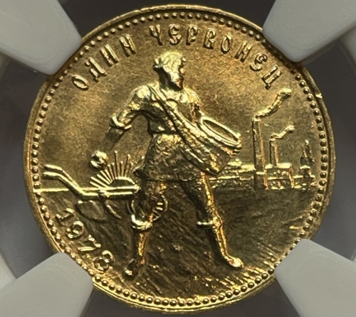 Изображение крестьянина-сеятеля на фоне плуга, восходящего солнца и заводов; по краю монеты точки, вверху надпись - «ОДИН ЧЕРВОНЕЦ», внизу слева — год выпуска - 1978.