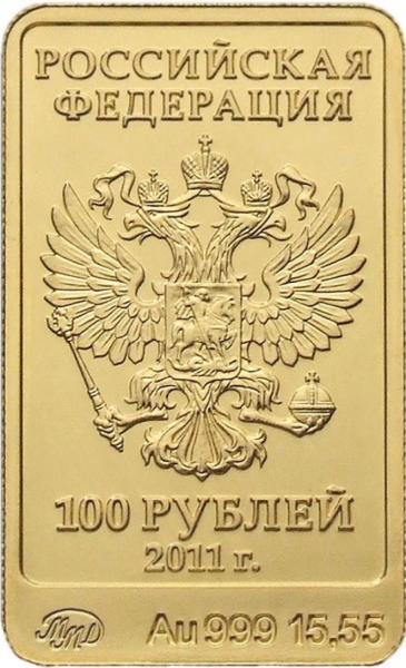 Аверс: в центре - рельефное изображение Государственного герба Российской Федерации (двуглавый орел, поднявший вверх распущенные крылья. Орел увенчан двумя малыми коронами и - над ними - одной большой короной, соединенными лентой. В правой лапе орла - скипетр, в левой - держава. На груди орла, в щите - всадник в плаще на коне, поражающий копьем опрокинутого навзничь и попранного конем дракона), надписи - над гербом в две строки: "РОССИЙСКАЯ ФЕДЕРАЦИЯ", под гербом в две строки - номинал: "100 РУБЛЕЙ" и дата: "2011 г.", внизу вдоль канта: слева - товарный знак монетного двора, в центре - обозначения металла и его проба, справа - содержание драгоценного металла в чистоте.