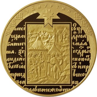 в картуше на фоне фрагмента древнерусской грамоты - миниатюра из Лицевого летописного свода XVI в. с изображением удмуртов в момент подачи прошения на вхождение в состав Русского государства; вверху на матированном картуше с орнаментом - восьмиконечный солярный знак и надпись по окружности: "УДМУРТИЯ".