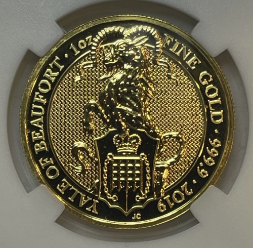 На этой золотой монете весом в одну унцию изображен еще один оригинальный портрет дизайнера монетного двора Royal Mint Джоди Кларк. Йель был изображен как существо царственного роста, редкое и великолепное. Его рога, его самая яркая особенность, являются фокусом в дизайне, сохраняя его тайну и древнее наследие.