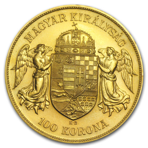 Реверс: Изображение герба Венгрии - щит, поддерживаемый двумя ангелами, венчает корона святого Стефана. Верхняя круговая надпись: "MAGYAR KIRALYSAG". Нижняя надпись - номинал золотой монеты: "100 KORONA".